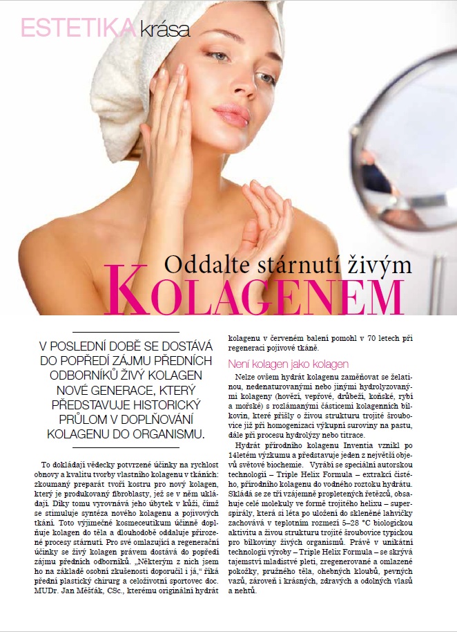 To dokládají vědecky potvrzené účinky na rychlost obnovy a kvalitu tvorby vlastního kolagenu v tkáních: zkoumaný preparát tvoří kostru pro nový kolagen, který je produkovaný fibroblasty, jež se v něm ukládají. Díky tomu vyrovnává jeho úbytek v kůži, čímž se stimuluje syntéza nového kolagenu a pojivových tkání. Toto výjimečné kosmeceutikum účinně doplňuje kolagen do těla a dlouhodobě oddaluje přirozené procesy stárnutí. Pro své omlazující a regenerační účinky se živý kolagen právem dostává do popředí zájmu předních odborníků. „Některým z nich jsem ho na základě osobní zkušenosti doporučil i já,“ říká přední plastický chirurg a celoživotní sportovec doc. MUDr. Jan Měšťák, CSc., kterému originální hydrát kolagenu v červeném balení pomohl v 70 letech při regeneraci pojivové tkáně.