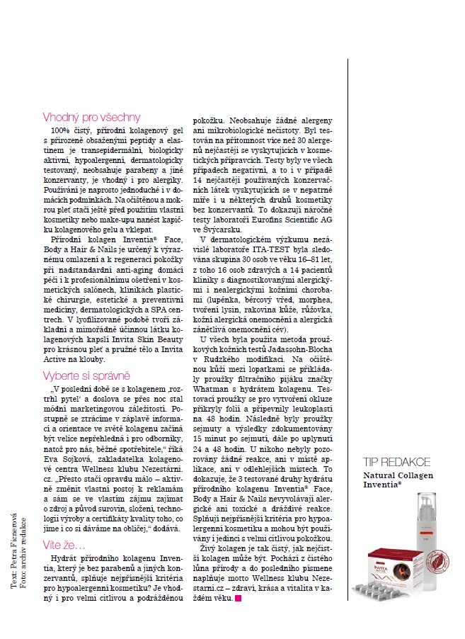 „V poslední době se s kolagenem ‚roztrhl pytel‘ a doslova se přes noc stal módní marketingovou záležitostí. Postupně se ztrácíme v záplavě informací a orientace ve světě kolagenu začíná být velice nepřehledná i pro odborníky, natož pro nás, běžné spotřebitele,“ říká Eva Sojková, zakladatelka kolagenového centra Wellness klubu Nezestárni.cz. „Přesto stačí opravdu málo – aktivně změnit vlastní postoj k reklamám a sám se ve vlastím zájmu zajímat o zdroj a původ surovin, složení, technologii výroby a certifikáty kvality toho, co jíme i co si dáváme na obličej,“ dodává.