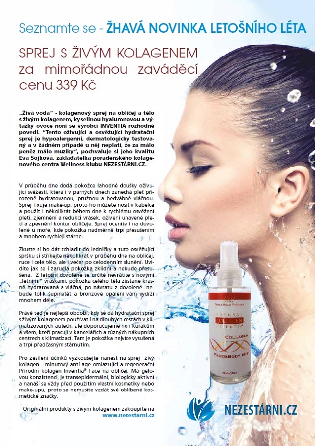 Živá voda“ - kolagenový sprej na obličej a tělo s živým kolagenem, kyselinou hyaluronovou a výtažky ovoce noni se výrobci INVENTIA rozhodně povedl. “Tento oživující a osvěžující hydratační sprej je hypoalergenní, dermatologicky testovaný a v žádném případě u něj neplatí, že za málo peněz málo muziky“, pochvaluje si jeho kvalitu Eva Sojková, zakladatelka poradenského kolagenového centra Wellness klubu NEZESTÁRNI.CZ.