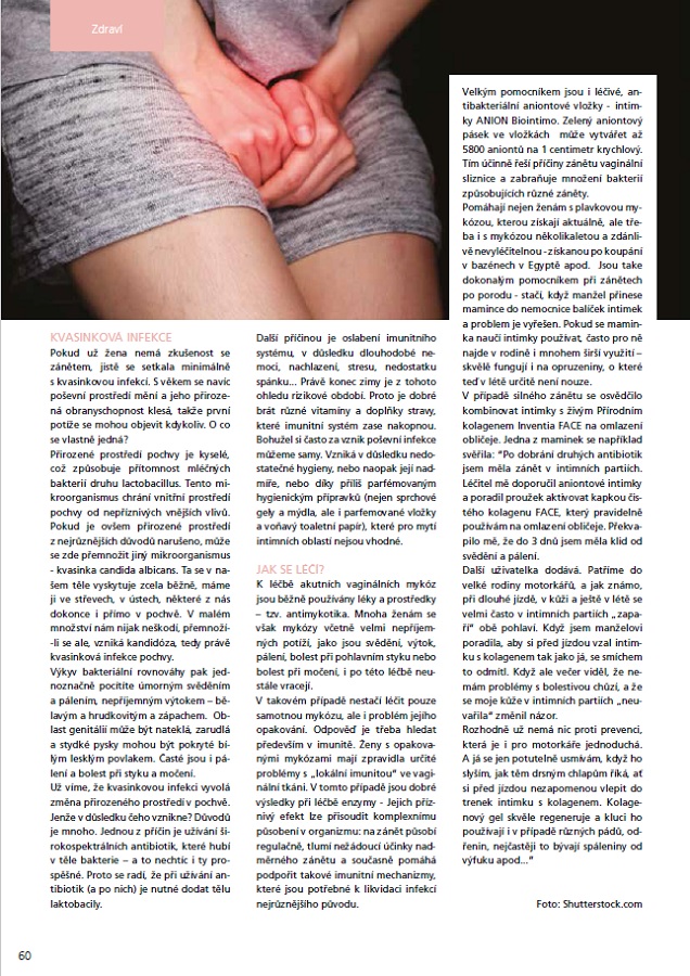 V případě silného zánětu se osvědčilo kombinovat intimky s živým Přírodním kolagenem Inventia FACE na omlazení obličeje. Jedna maminek se například svěřila: “Po dobrání druhých antibiotik jsem měla zánět v intimních partiích. Léčitel mě doporučil aniontové intimky a poradil proužek aktivovat kapkou čistého kolagenu FACE, který pravidelně používám na omlazení obličeje. Překvapilo mě, že do 3 dnů jsem měla klid od svědění a pálení.
