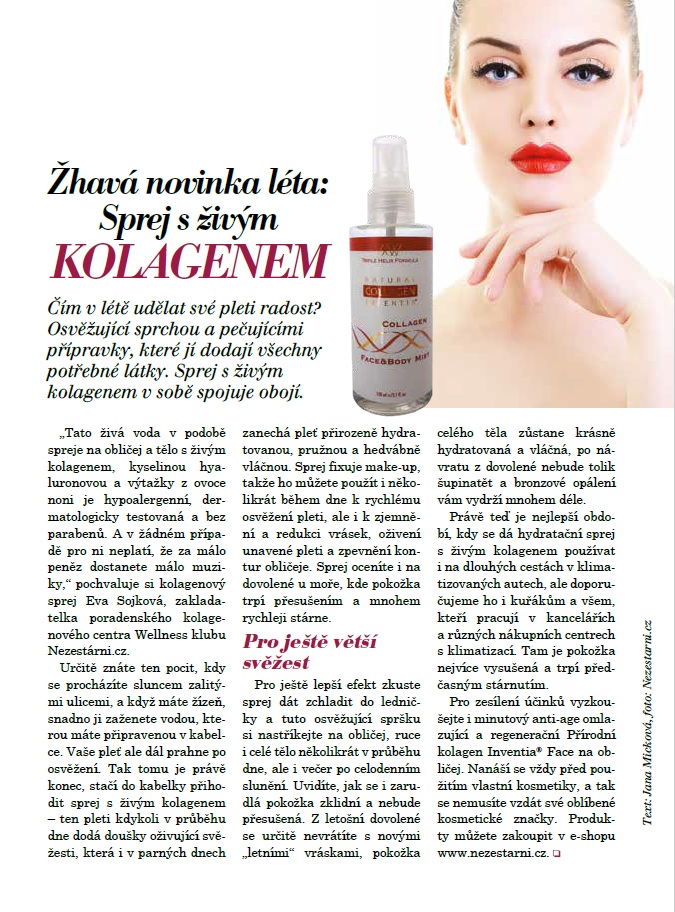 „Tato živá voda v podobě spreje na obličej a tělo s živým kolagenem, kyselinou hyaluronovou a výtažky z ovoce noni je hypoalergenní, dermatologicky testovaná a bez parabenů. A v žádném případě pro ni neplatí, že za málo peněz dostanete málo muziky,“ pochvaluje si kolagenový sprej Eva Sojková, zakladatelka poradenského kolagenového centra Wellness klubu Nezestárni.cz.